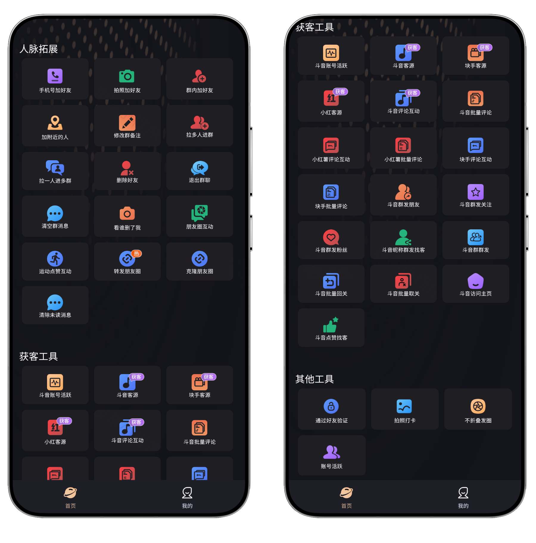 该版本已解锁所有功能,无需登录即可使用。首页涵盖全发图文、手机号加好友、克隆朋友圈、某音/小红薯/某手获客等功能。