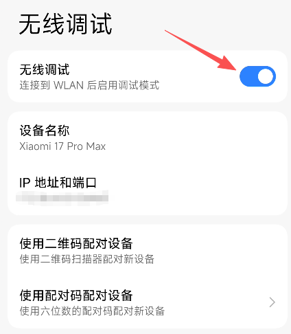 5、开启无线调试模式,点击 使用配对码配对设备,记录下这个码